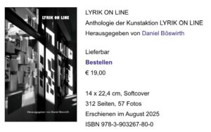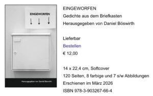 DANIEL BÖSWIRTH: Aktuell ist die Anthologie „Eingeworfen/Gedichte aus dem Briefkasten“ erschienen. Im Oktober 25 hängte ich im Zuge der Ausstellung LYRIK ON LINE einen weißen Briefkasten ins Foyer der Wiener Hauptbücherei. Aus den eingeworfenen Gedichten entstand dieser Band, in dem auch Dialektgedichte enthalten sind. Meine Initiative, eine öffentliche Poesie-Gedankenhaltestelle – eine Art poetische Begegnungszone – in Wien zu errichten, bei der zwar der Körper an Ort und Stelle bleibt, aber der Geist wegfährt, scheiterte bisher am mangelnden Interesse der Institutionen oder Kooperationspartnern.