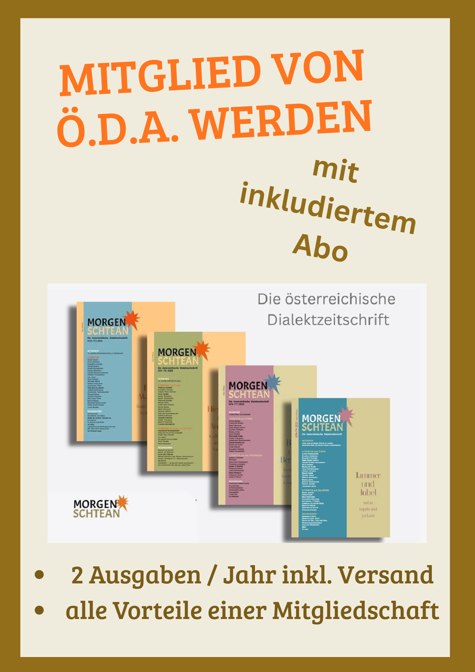 Eine Mitgliedschaft bei Ö.D.A. -Österr. Dialektautor:innen und -archive beinhaltet zwei Morgenschtean-Ausgaben pro Jahr inkl. Versand* sowie die Zustellung des Ö.D.A. Newsletters**.